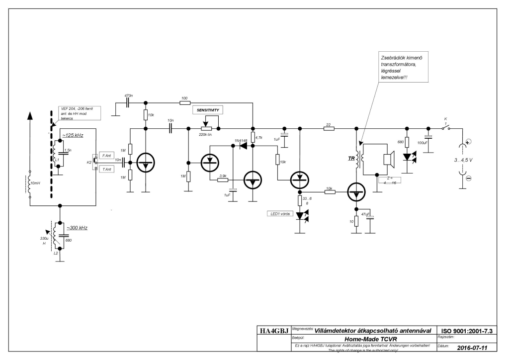 Az én általam megépített példány több változatban megtalálható az interneten. A rendelkezésemre álló kacattárban található alkatrészekből, kis áramköri módosításokkal alakítottam ki a kapcsolást, amely jól bevált. Az erős villámokat már 250-300 km távolságból felvillanással jelzi. A zivatar közeledtével a villanások ereje és száma a közeledéssel arányos. Ha a zivatar felettünk van, a detektor sorozatfénye erős, hang is erősebben recseg, mint a hosszú- és középhullámú rádiókban. Intenzív zivatarok esetében a villogás és a hang folyamatosan látható, hallható. Igaz, ekkor már füllel is lehet a dörgéseket hallani, és látni a villámok fényét.