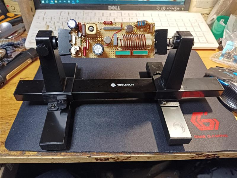 A képen látható szerkezetet "harmadik kéz gyanánt - az ellenség keze betette a lábát" szellemében szereztem be, Sokszor használom, mert azon túlmenően, hogy kellő erővel befogja a panelt, a szigetelő anyagból készült pofák lehetővé teszik, hogy nagyobb feszültségeket kapcsolhassak az áramkörökre, anélkül, hogy áramütés vagy zárlat veszélye állna fenn az állvány megfogásakor. A forgatható megoldás lehetővé teszi, hogy a szerelési oldal felől behelyezett alkatrészt 180 fokos elfordítás után a másik oldalon be lehessen forrasztani az áramkörbe. 300 x 250 mm a legnagyobb befogható panel méret, ez többnyire elegendő az általam készített áramkörök befogásához. Az egyik befogó pofát rugó szorítja ellen a munkadarab felé. A szorítás oldása, ill. az állványok közelebbi, vagy távolabbi helyzetbe tolhatók és csavaros rögzítéssel fixálhatók.