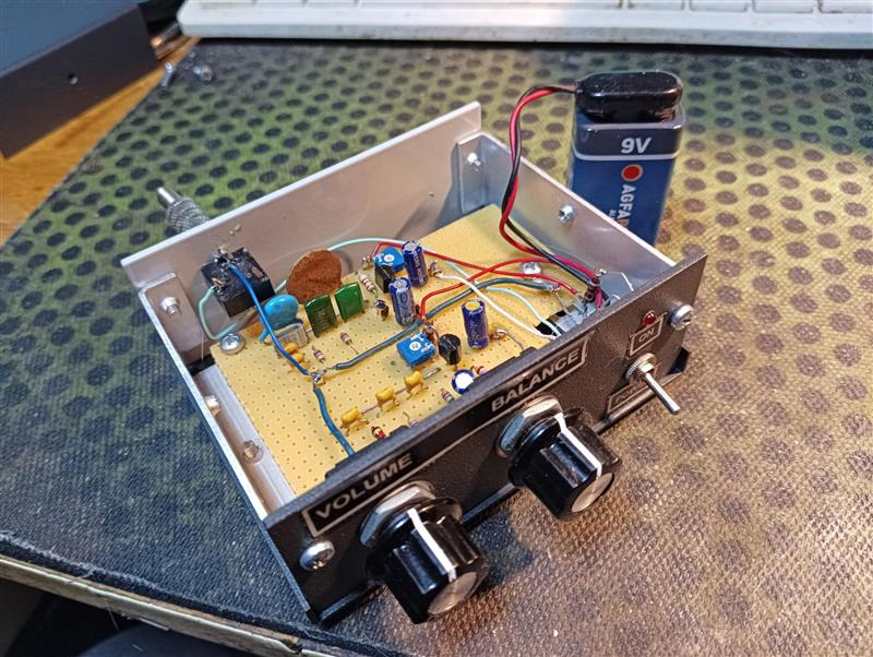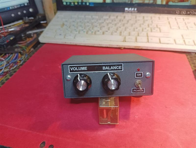 A vásárolt modul dobozba sikerült bele applikálni az "öcsi" panelre szerelt áramkört. A kimeneti 3,25 mm-es jack aljzatba dugható a TCVR mikrofon bemenetéhez illő csatlakozó dugó. A bekapcsoláskor azonnal megjelenik a kevert két hang a kimeneten és egyben a TCVR PTT indítása is megtörténik. A kimeneti jelszintet (MIC. GAIN) a VOLUME potenciométerrel lehet beállítani. A kimeneti jelek közti egyensúlyt a BALANCE potenciométer állítja, amit oszcilloszkópon lehet ellenőrizni.