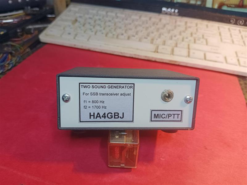Jó 30 éve már készítettem egy ilyen eszközt a Rádiótechnikában közölt egyik cikk alapján, de a jelenlegi lakóhelyemre való költözködés utáni kicsomagoláskor nem találtam sehol. Most azonban szükség lett volna rá, így kénytelen voltam összetákolni egyet. A kapcsolás szuperprimitív, egy-egy tranzisztorral felépített fázistolós oszcillátor, melyeket egy keverő potenciométer (BALANCE) állít be egyforma amplitúdóra, majd az együttes jelet egy szint beállító potenciométer (VOLUME) vezet a TCVR mikrofon bemenetére. A készülék tápellátás kapcsoló együtt a TCVR PTT áramkörét is kapcsolja, hogy ne kelljen külön a mikrofonnal adásra váltani a készüléket. A generátor kimenete max. 100 mV - ami bőven elég a bemeneti meghajtáshoz. A tápforrás egy 9V-os mini telep.